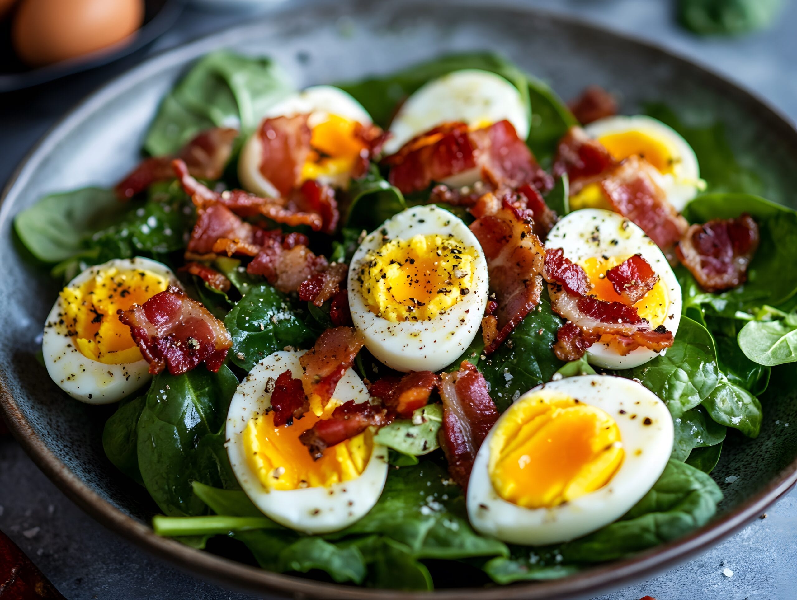 9.Spinacini, pancetta croccante, uova sode