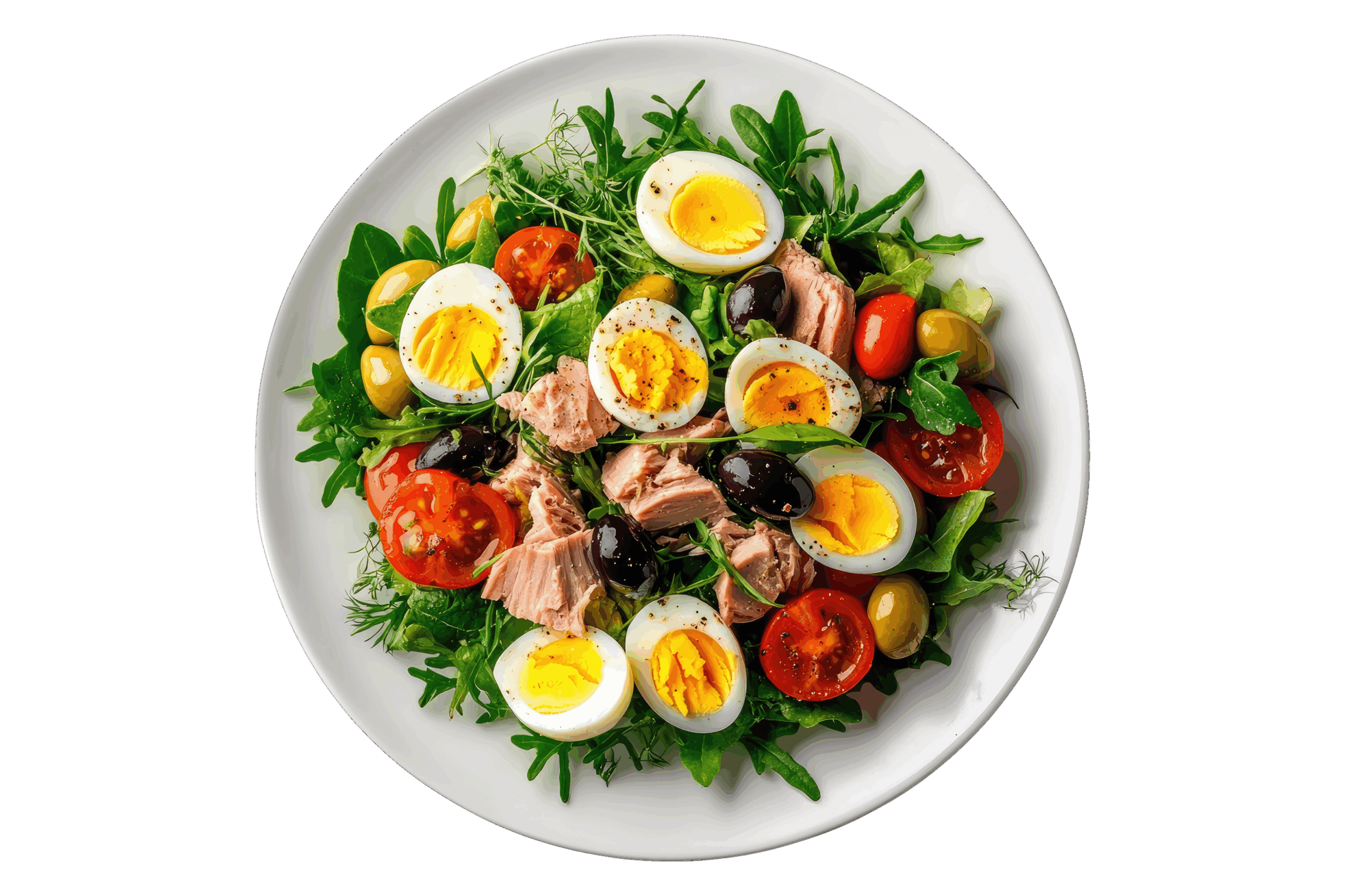 7.Uova sode, tonno, olive nere e verdi, pomodorini, misticanza