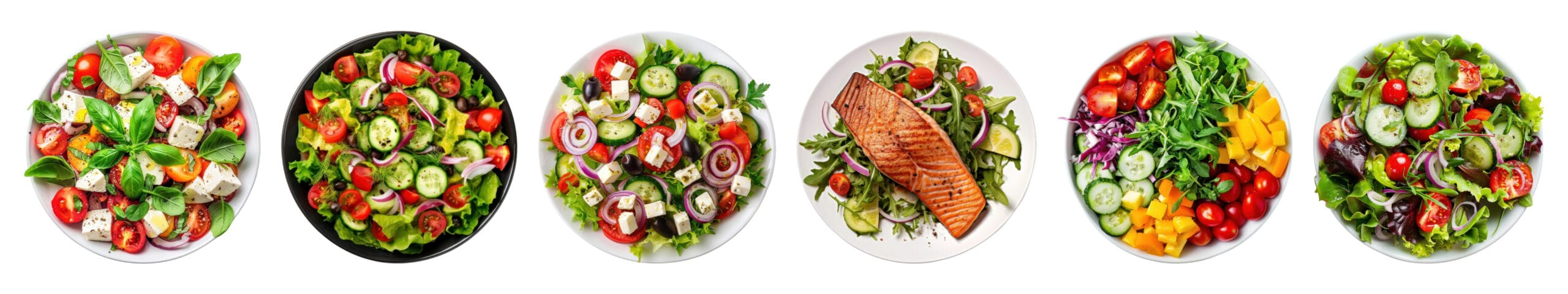 1.Feta, pomodorini, basilico, cipolla tropea. 2. Lattughino, pomodorini, cetrioli, cipolla tropea. 3. Feta, olive nere, pomodorini, cipolla tropea, misticanza. 4. Rucola, lime, cipolla, pomodorini, salmone alla piastra. 5. Pomodorini, radicchio, valeriana, rucola, cetrioli, peperoni. 6. Misticanza, pomodorini, cetrioli cipolla tropea.