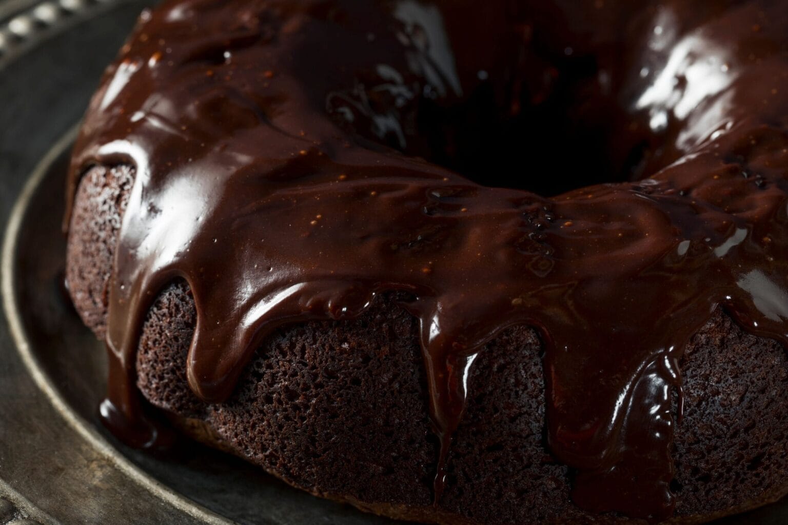 Appena sfornato il ciambellone, senza sformarlo, lo bucherello con uno stecchino lungo e verso sopra la ganache calda, lasciandola penetrare nei fori. Lascio raffreddare completamente per un’ora, finché la crema si sarà assorbita e il dolce risulterà lucido in superficie.