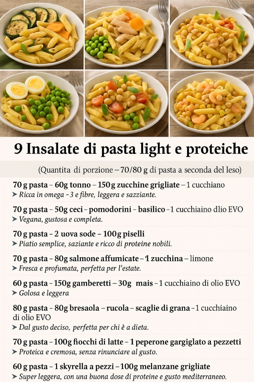 In questo articolo ho raccolto 9 idee di insalate di pasta light e proteiche, perfette per chi cerca un piatto equilibrato, saziante e facile da digerire. Sono tutte pensate per una porzione singola e variano tra i 70 e gli 80 grammi di pasta a seconda del condimento, così da poterle adattare anche in base alle proprie esigenze nutrizionali o al piano alimentare.