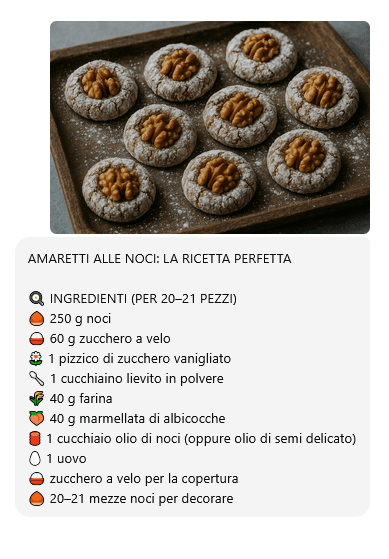 Gli amaretti alle noci sono un’alternativa raffinata ai classici amaretti alle mandorle. Hanno una consistenza leggermente morbida, un profumo intenso e uno stile “rustico” irresistibile. Questa versione è pensata per essere semplice, precisa e adatta a chi desidera un dolcetto veloce da preparare ma con un risultato impeccabile.