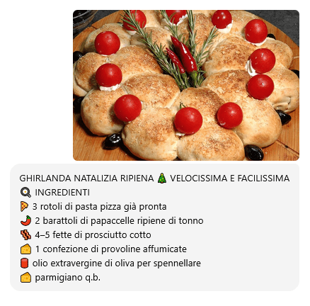 Lo scorso Natale questo antipasto è piaciuto a tutti, ho accompagnato la corona natalizia con affettato misto di formaggi, prosciutto e sott’olio. Dovrete dedicargli poco del vostro tempo, questo vi permetterà di poter cucinare tutto il resto con assoluta tranquillità.