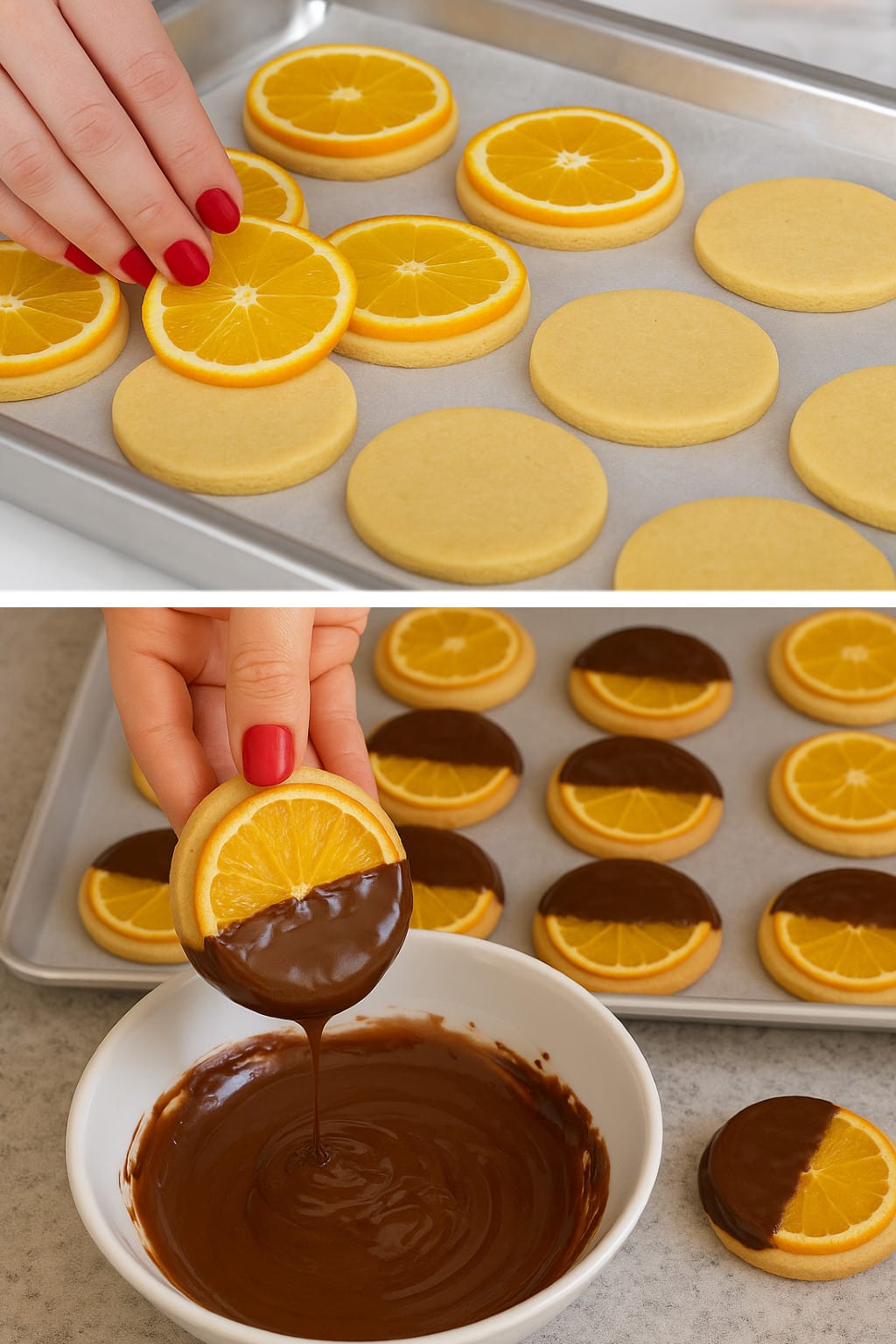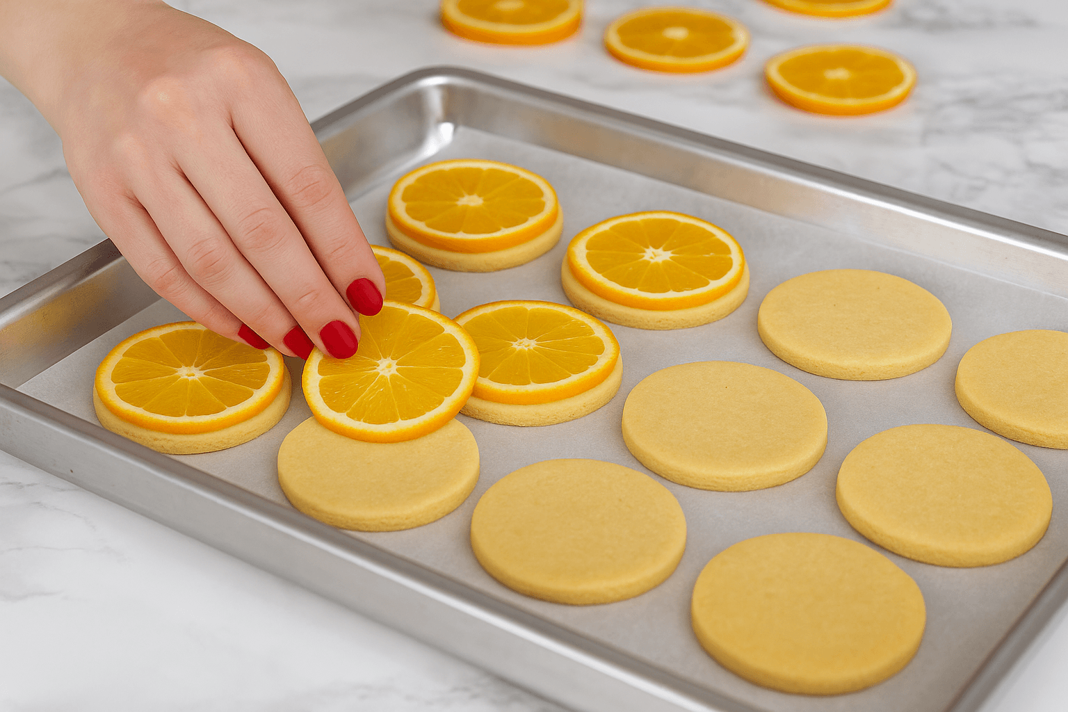 Adagia una fettina sottile di arancia sopra ciascun disco di pasta. Premi leggermente con le dita per farla aderire bene.