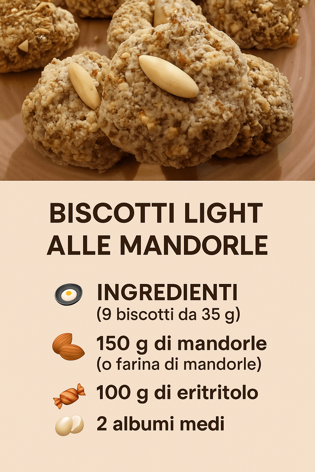 Preriscaldiamo il forno a 160° e foderiamo una teglia con carta forno. In una ciotola uniamo la farina di mandorle e l’eritritolo, poi aggiungiamo gli albumi leggermente sbattuti. Mescoliamo con una spatola fino a ottenere un composto denso e compatto.