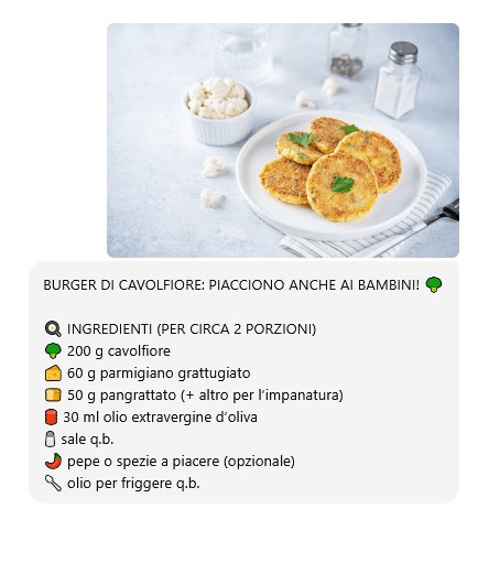 I burger di cavolfiore, con la loro crosticina invitante, hanno convinto anche i piccoli di casa a mangiare verdure. All’inizio, mi sono servita di un piccolo inganno: li servivo accompagnati dalle patatine fritte, per distogliere l’attenzione. Quando mi chiedevano cosa fossero quei medaglioni dorati, mentivo spudoratamente e omettevo che si trattava di broccoli. Con il tempo, hanno capito e hanno iniziato ad apprezzare anche i miei sforzi per assicurare loro un’alimentazione completa, sana ed equilibrata. Oggi sono giunta al punto che me li commissionano proprio: se mi accompagnano a fare la spesa, mi invitano a comprare cavolfiore proprio in vista della preparazione di questo piatto.