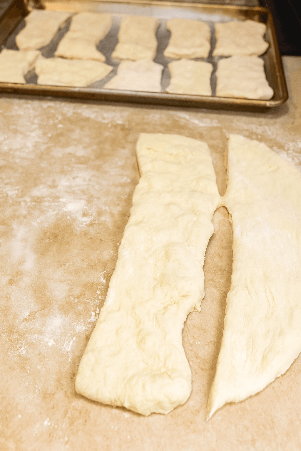 Quando l’impasto sarà ben gonfio, rovesciamolo delicatamente su una spianatoia ben infarinata. Stendiamolo con i polpastrelli delle dita, senza lavorarlo troppo. Spolveriamo di farina la superficie e tagliamo in tanti rettangolini.