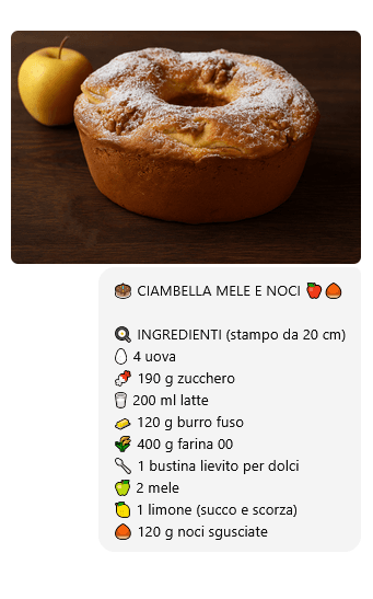 Questa ciambella mele e noci è un dolce rustico e genuino, di quelli che profumano tutta la casa mentre cuociono in forno. Mi piace prepararla nelle giornate fredde, quando ho voglia di qualcosa di semplice ma ricco di gusto: le mele regalano morbidezza e umidità all’impasto, mentre le noci aggiungono quella croccantezza irresistibile che la rende perfetta per colazione o merenda.