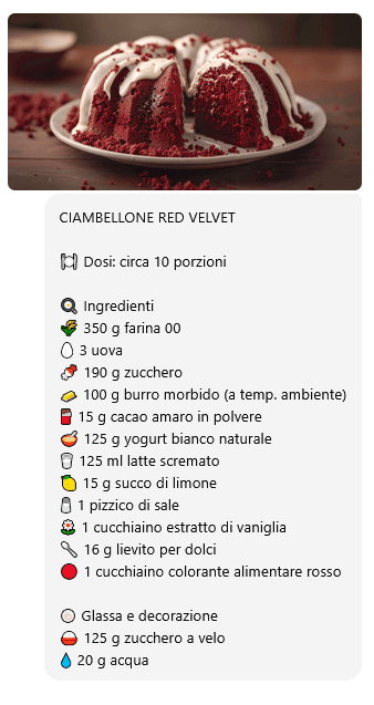 L’impasto è soffice, umido e colorato, grazie al tocco del colorante rosso. Il risultato finale è un dolce scenografico ma facile da realizzare, perfetto per chi vuole stupire senza complicarsi la vita.