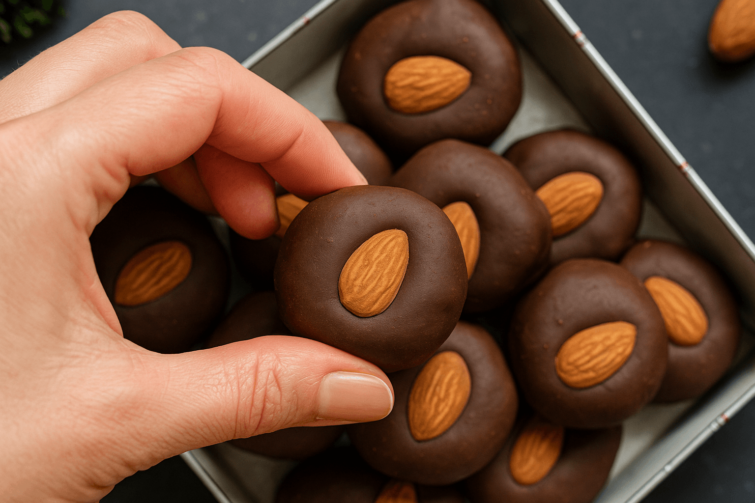 Per una versione più golosa sciolgo il cioccolato fondente e immergo i dolcetti uno alla volta, poi li appoggio su un foglio di carta forno e completo con qualche pezzetto di frutta secca. Li lascio rassodare in frigorifero finché la copertura diventa lucida e croccante.