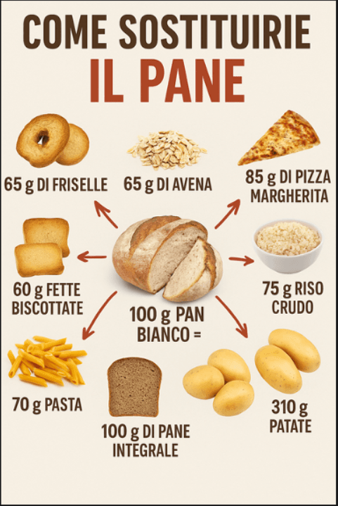 L’infografica mostra in modo pratico quali alimenti corrispondono, dal punto di vista energetico, a 100 grammi di pane bianco. Le equivalenze si basano su contenuti simili in termini di carboidrati e apporto calorico, pur tenendo conto di lievi differenze nutrizionali.