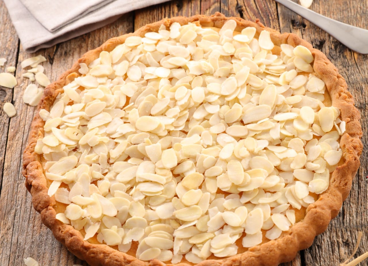 Verso la crema sul guscio di sfoglia, ricoprendo i mirtilli, poi completo con un’abbondante manciata di mandorle a lamelle.
