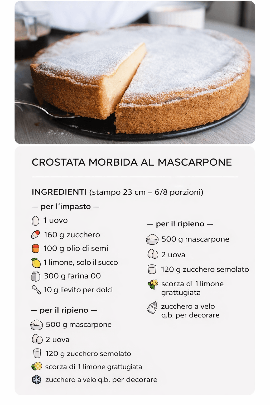 Inusuale, ma apprezzatissima, la crostata morbida al mascarpone è uno di quei dolci che conquista grandi e piccini. Un guscio friabile e sottile accoglie un ripieno cremosissimo che fa tornare bambini.