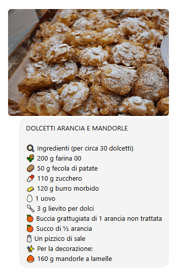 I dolcetti arancia e mandorle sono piccoli pasticcini profumati e friabili, perfetti da servire con il tè o come dolce fine pasto. Hanno la consistenza morbida della frolla soffice e un aroma agrumato irresistibile, arricchito dal gusto delle mandorle tostate in superficie. La ricetta è semplice ma precisa: basta rispettare i tempi di riposo dell’impasto per ottenere pasticcini delicati che si sciolgono in bocca.