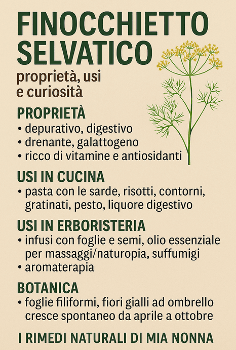 Il finocchietto selvatico è ricco di acqua, flavonoidi e oli essenziali dal profumo inconfondibile.