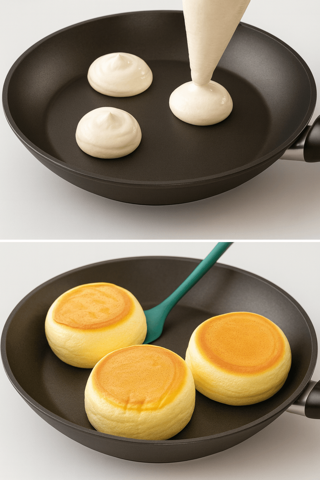 Scaldo una padella antiaderente a fuoco molto basso e la ungo con pochissimo burro, eliminando l’eccesso con carta da cucina. Verso un cucchiaio di impasto per ogni pancake e aggiungo qualche goccia d’acqua sul fondo della padella (serve a creare vapore e a gonfiarli meglio). Copro subito con un coperchio e lascio cuocere 2 minuti.