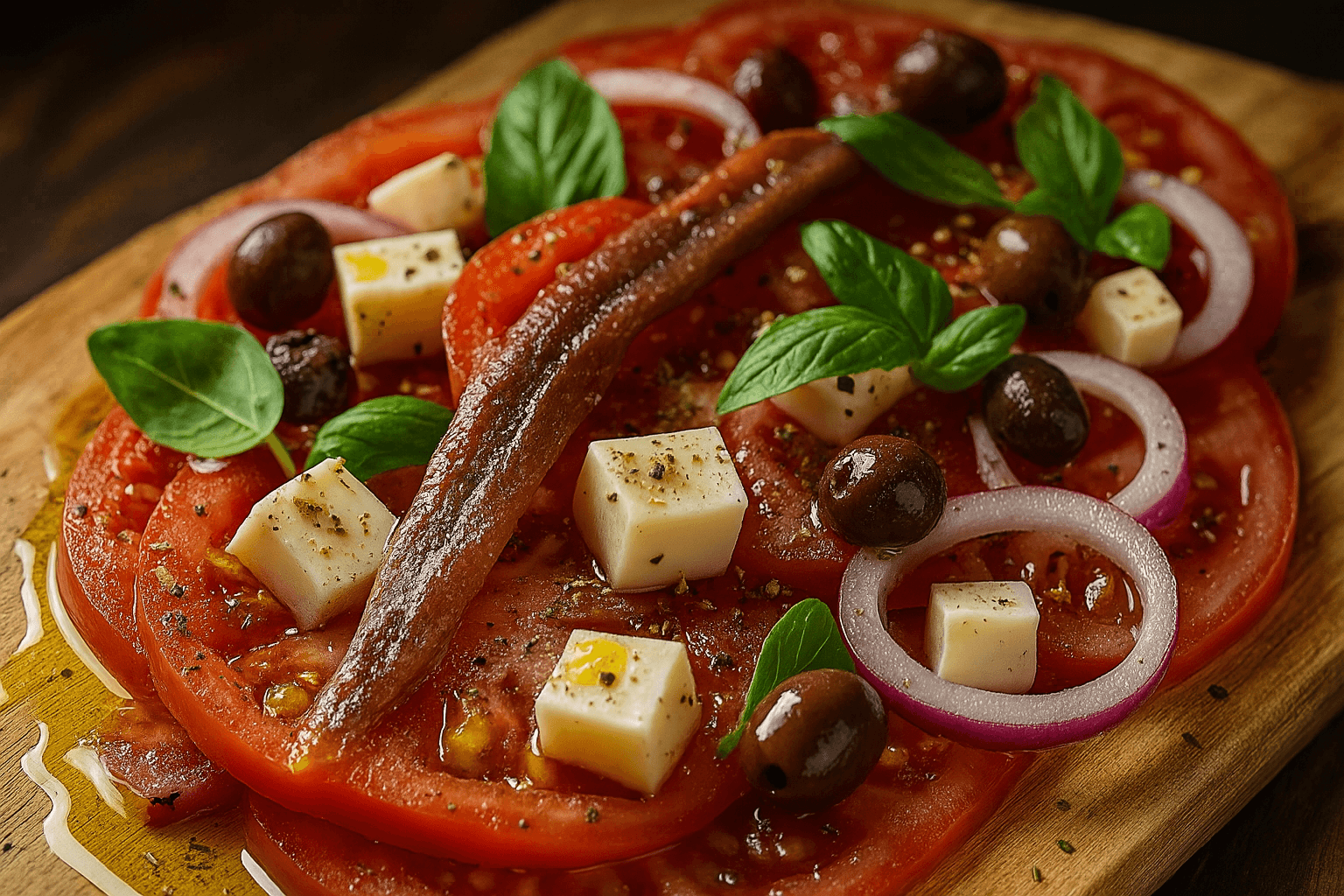 Quando il caldo si fa sentire e l’appetito cala, preparo questo piatto fresco, saporito e incredibilmente elegante: un carpaccio di pomodori cuore di bue con cipolla rossa di Tropea, primo sale, olive taggiasche e le meravigliose alici sottolio di Cetara. Il tocco finale? Una vinaigrette leggera all’aceto balsamico IGP, profumata con origano e basilico fresco.