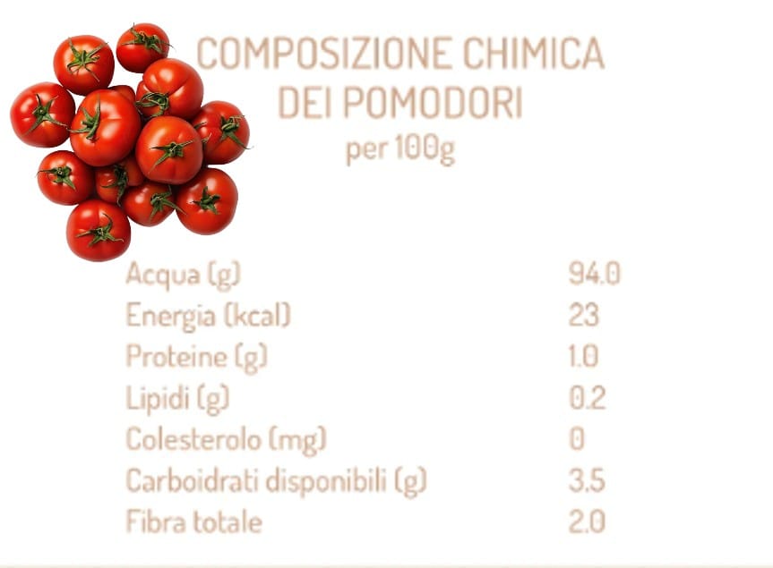 Veniamo alle proprietà nutritive del pomodoro. Ricchissimo di acqua, con oltre il 94% del totale, apporta pochissime calorie. A seconda delle varietà e del grado di maturazione, la media per ogni 100 grammi è di 17 Kcal.