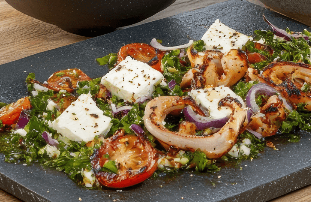 Scaldiamo la piastra o la griglia fino ad arroventarla, riprendiamo i calamari e cuociamoli per pochi minuti e saltiamo anche i pomodorini. Trasferiamoli in un recipiente, aggiungiamo l’insalata, la cipolla, le olive denocciolate e la feta. Diamo una bella mescolata.