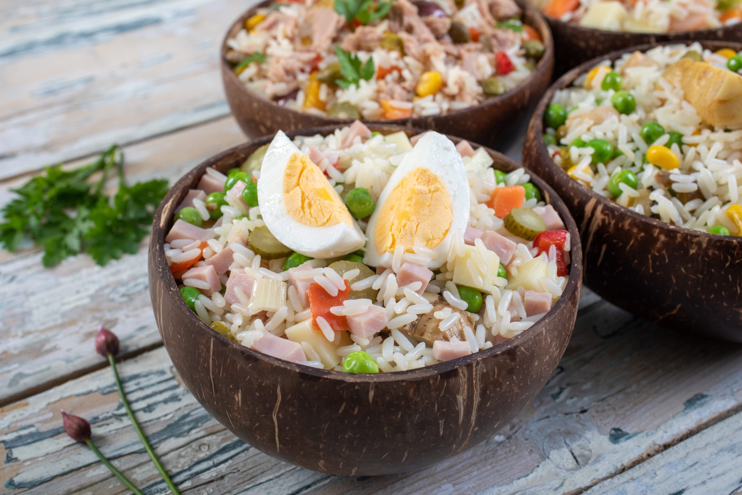 Nell’attesa, riduciamo a dadini il prosciutto e il formaggio primo sale, poi riprendiamo le nostre ciotole e uniamole tutte nel recipiente del riso per arricchirlo e realizzare il nostro piatto finale! Si conserva per 4 giorni, saporito e invitante, ma ovviamente sigillato dalla pellicola alimentare e riposto… indovinate (!!!) in frigo, ovviamente!