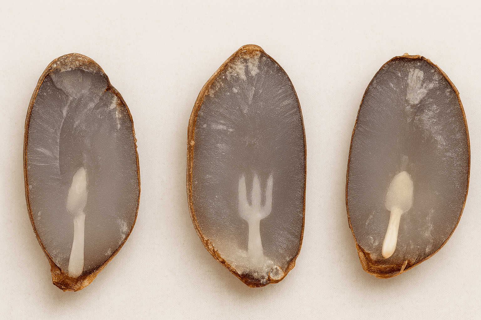 Basta aprire un frutto per trovare questi piccoli chicchi di pochi centimetri di lunghezza. Sembrano irrilevanti, ma nascondono un segreto! Dividiamoli a metà e vedremo comparire sullo sfondo scuro, un’immagine chiara, nitida, di immediata interpretazione: una posata!