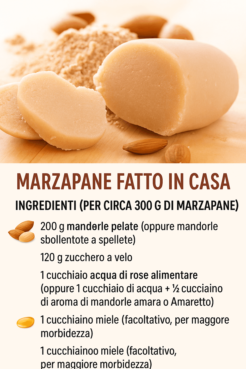 Preparare il marzapane in casa è una piccola magia: bastano poche mandorle, un po’ di zucchero e il profumo delicato dell’acqua di rose per ottenere un impasto morbido, elegante e perfetto per dolci, decorazioni o piccoli regali golosi. In questa versione condivido la mia preparazione preferita, semplice e tradizionale, con qualche trucco per ottenere un risultato liscio, profumato e compatto come quello delle pasticcerie.