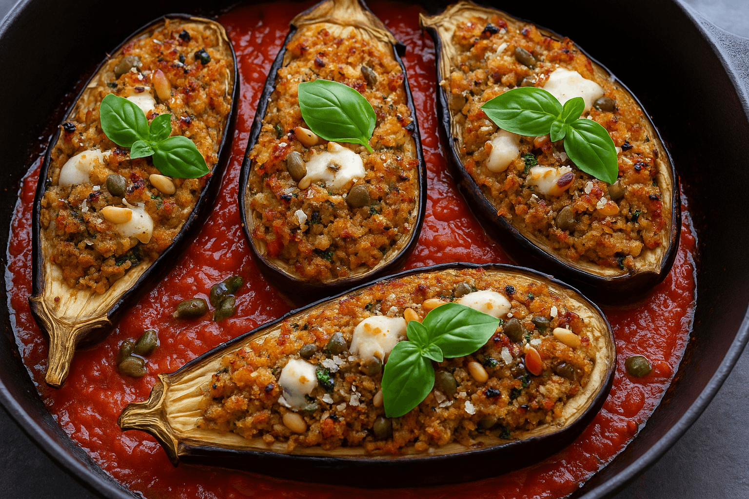 Impossibile resistere alla ricetta di mia nonna. La farcitura a base di polpa di melanzane, pane raffermo, pinoli, capperi, uovo e basilico ci regala tutto il sapore del mediterraneo. Le calotte ripiene cuociono in forno ricoperte di passata di pomodoro, mozzarella e parmigiano che rende ancora più invitante questo piatto.
