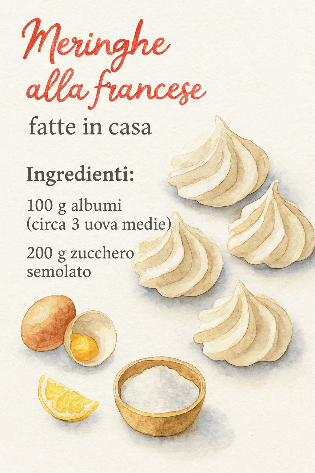 Nota per il blog: mantengo il rapporto 1:2 albumi/zucchero per scalare la ricetta (ad esempio 120 g albumi + 240 g zucchero). Questa pagina è ottimizzata per ricerche come “meringhe alla francese bianche e croccanti”, “come non far ingiallire le meringhe”, “becco d’aquila meringa”.
