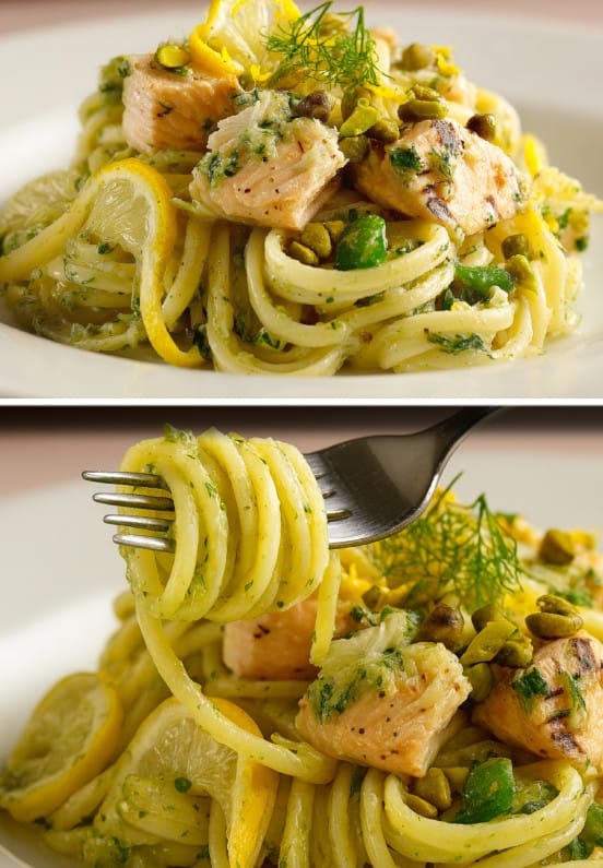 Pasta con pesto di pistacchi e salmone