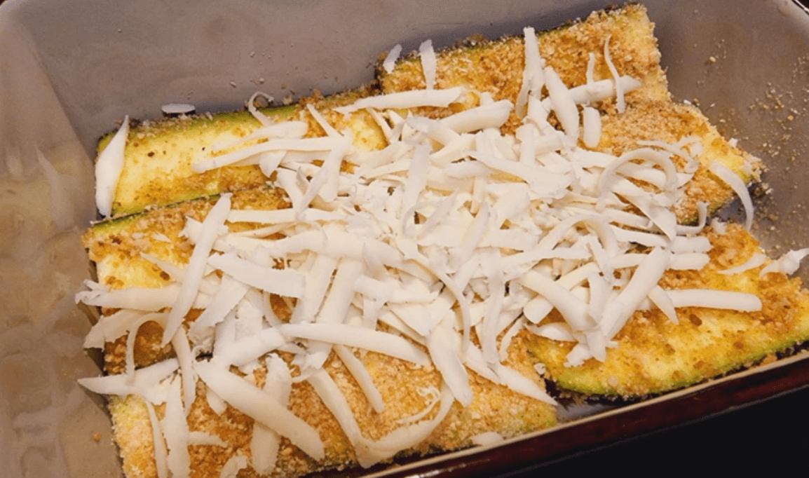 - Aggiungiamo i formaggi: spolveriamo con metà del parmigiano e metà della scamorza tagliata a julienne (usando una grattugia a fori larghi). Ripetiamo con un secondo strato identico: zucchine impanate, uova, parmigiano e scamorza.