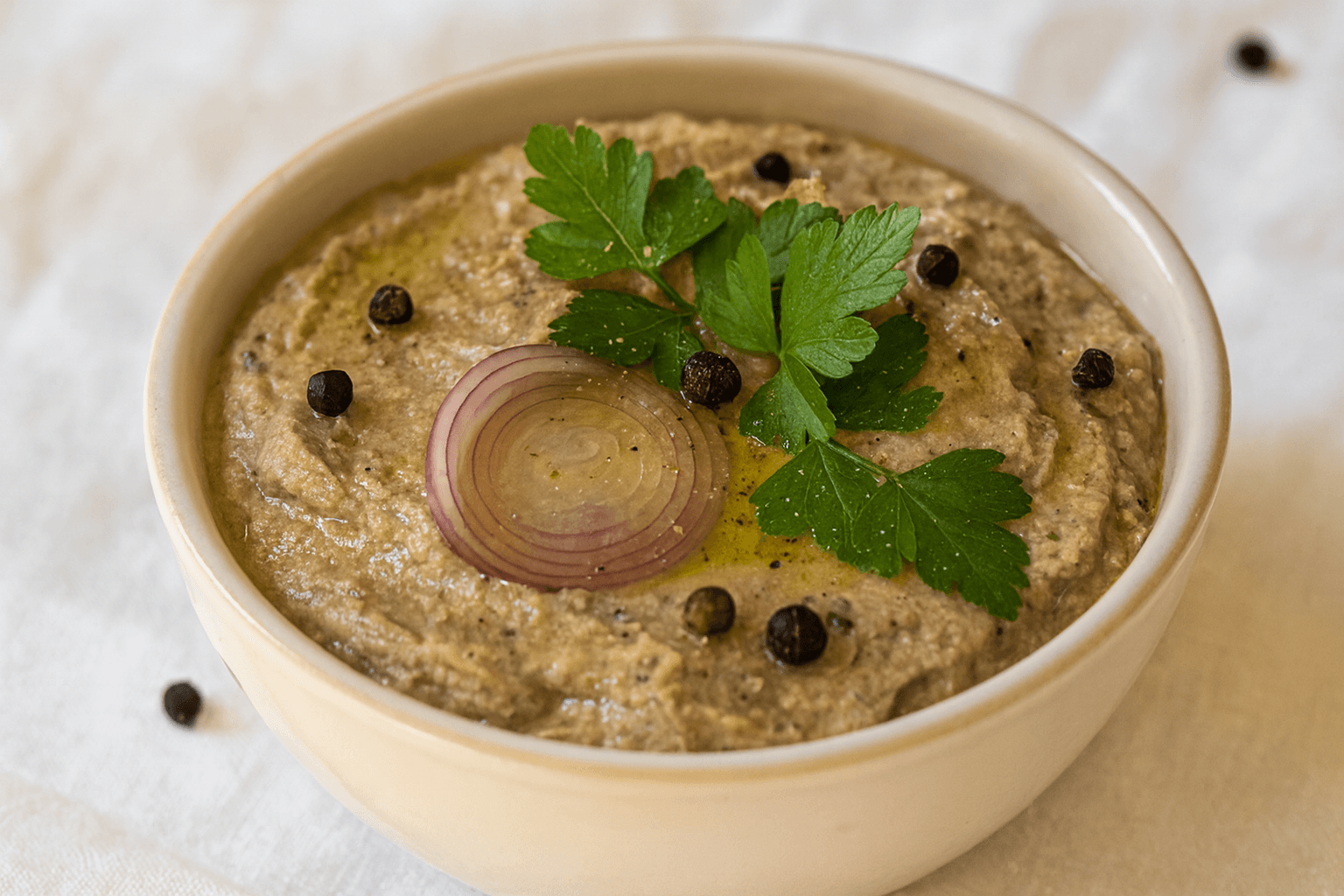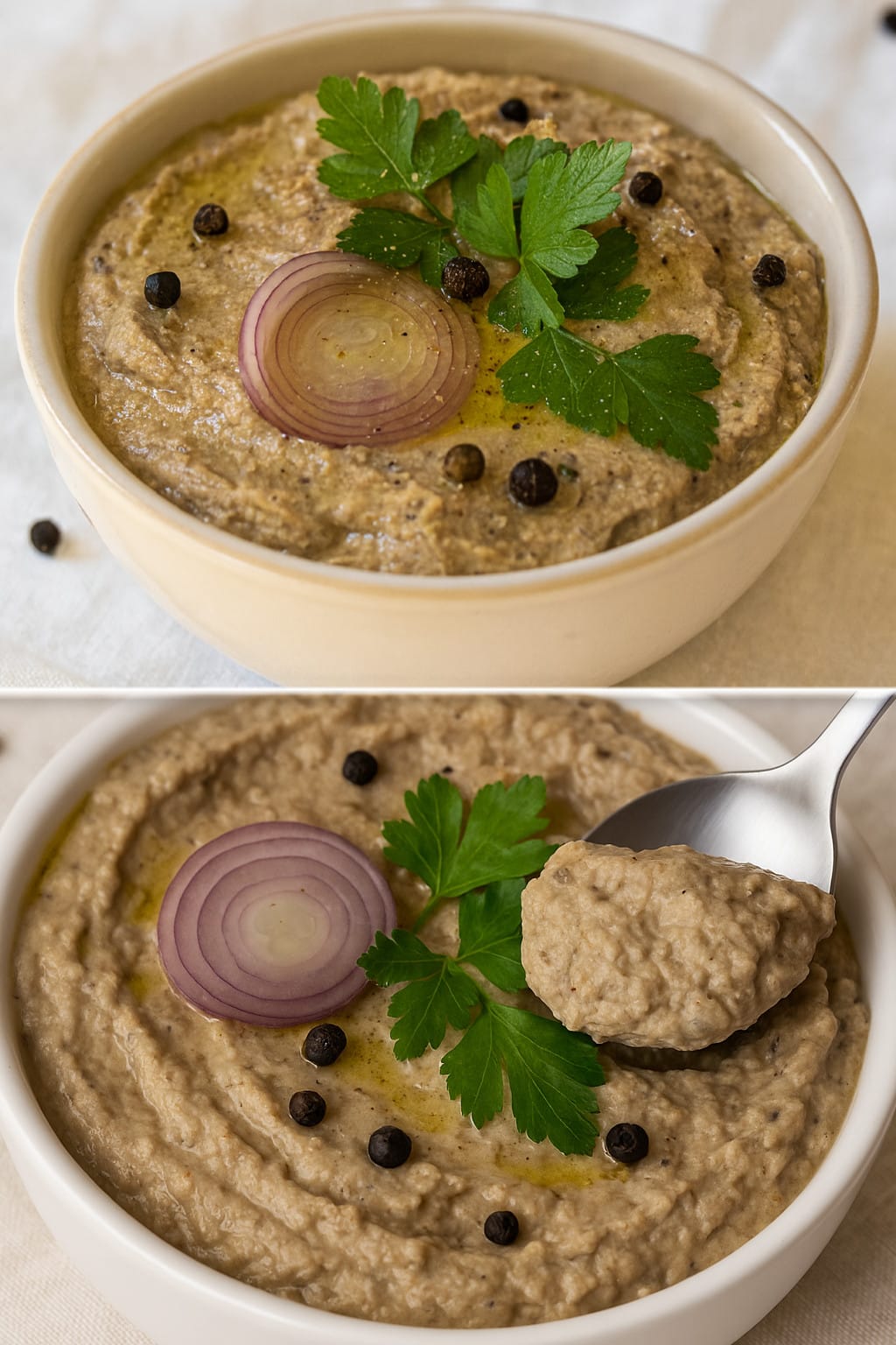 Trasferiamo il pâté in una ciotola o in piccoli vasetti di vetro, copriamo e lasciamo riposare in frigorifero per circa 15–20 minuti prima di servirlo.