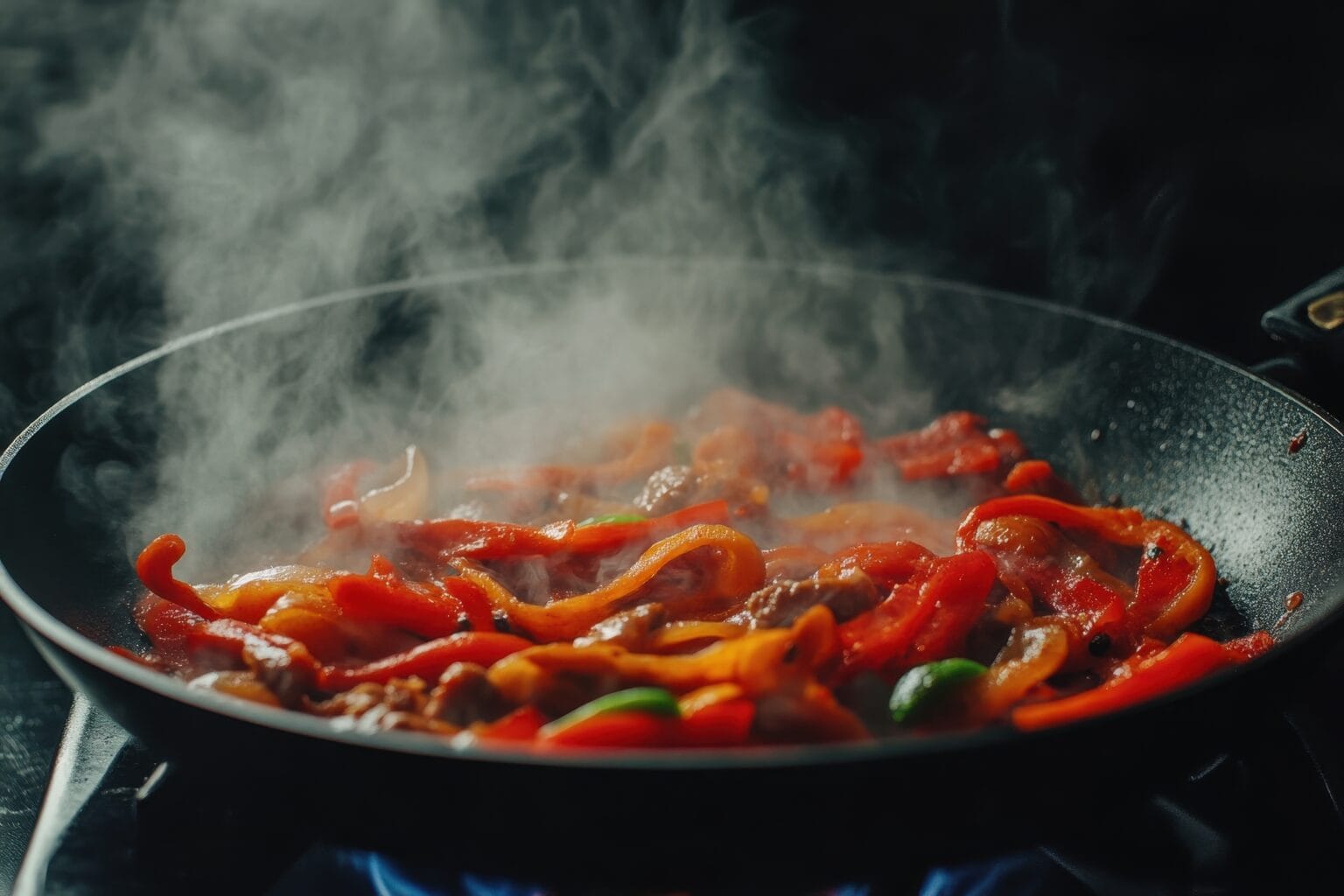 Trascorsi 7 – 8 minuti, togliamo il coperchio e lasciamo cuocere il tutto fino a che sul fondo rimane soltanto l’olio. Prima di spegnere aggiungiamo le olive taggiasche, amalgamiamole ai peperoni e il nostro piatto è pronto.