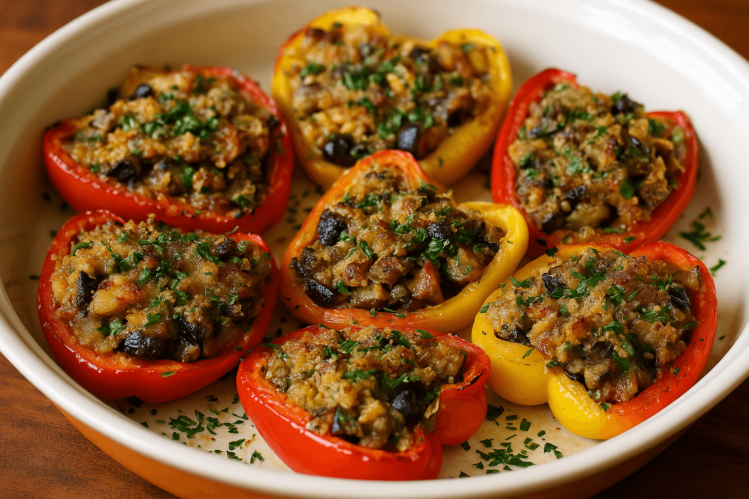 Colorati, profumati e saporiti: i peperoni ripieni così fanno subito estate. In questa versione ho scelto un ripieno ricco ma senza carne, a base di pane raffermo, melanzane rosolate, olive nere, capperi e qualche filetto di acciuga per dare sapidità e profondità di gusto.