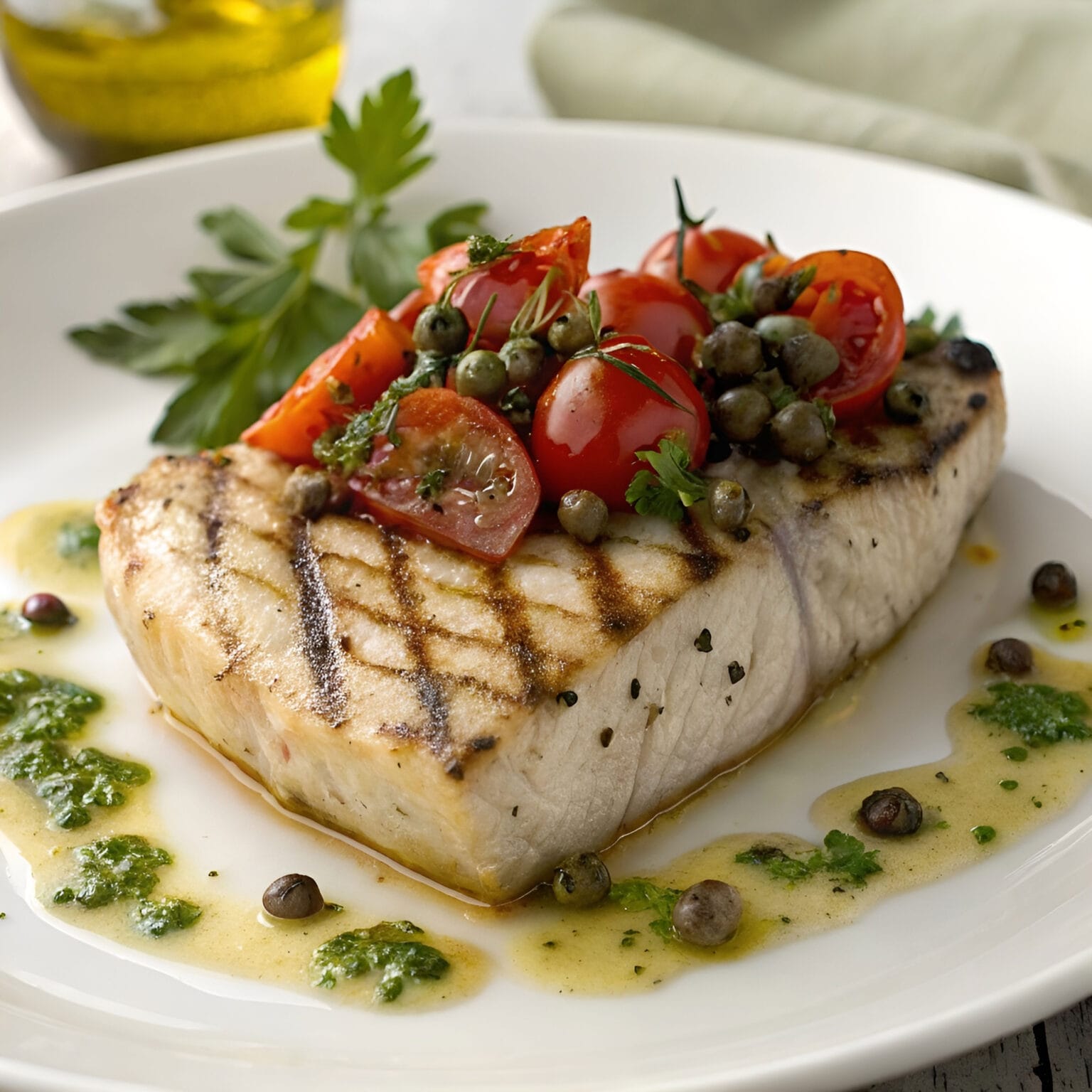 Il pesce spada alla griglia è uno dei piatti più amati dell’estate: leggero, saporito e velocissimo da preparare. Nella mia versione, lo accompagno con un condimento fresco e aromatico a base di pomodorini ciliegino, pesto di prezzemolo, olive nere e capperi sotto sale.
