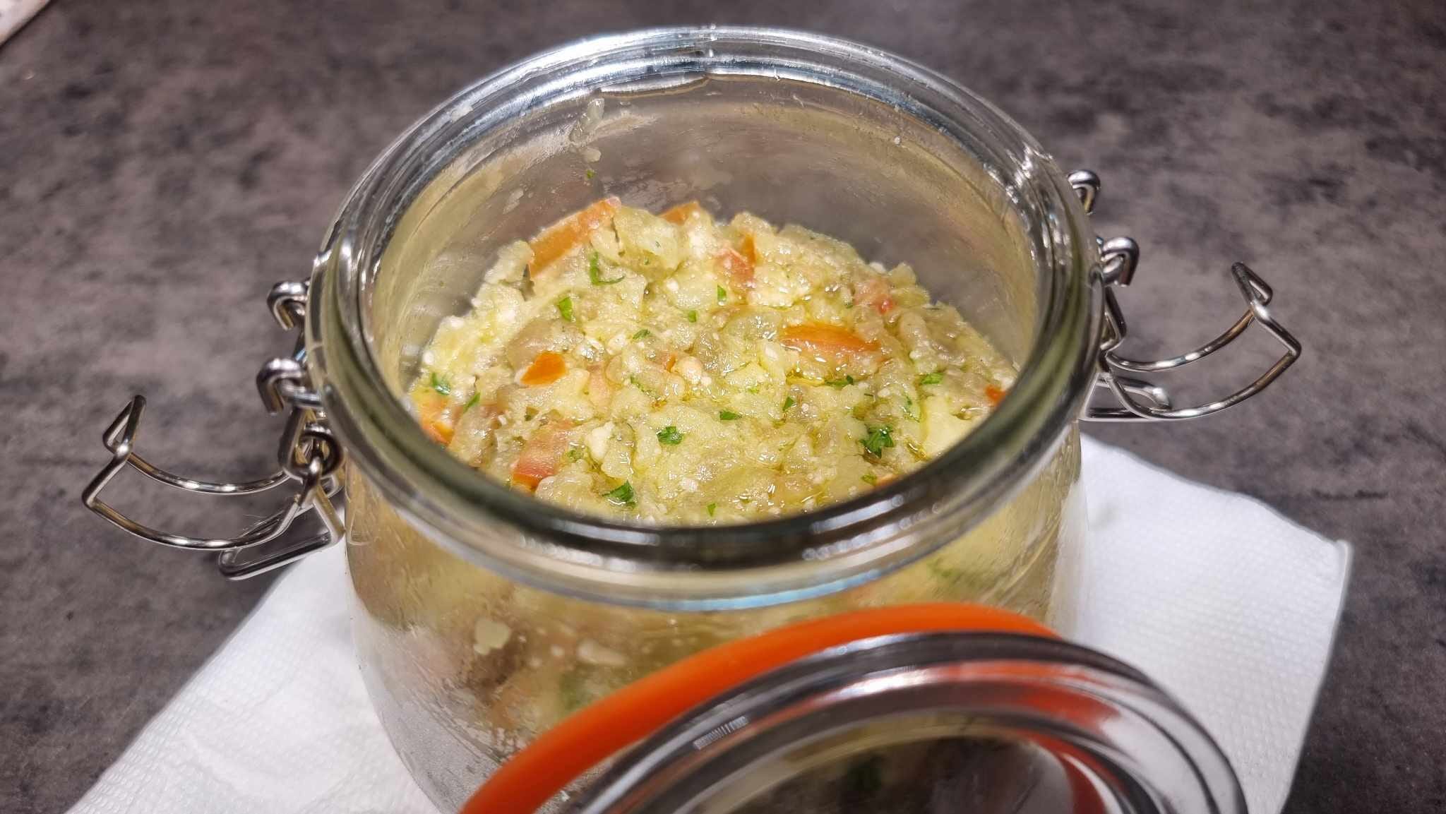 Il pesto di melanzane è delizioso appena fatto, ma può essere conservato in un barattolo sterile in frigorifero per 3-4 giorni.