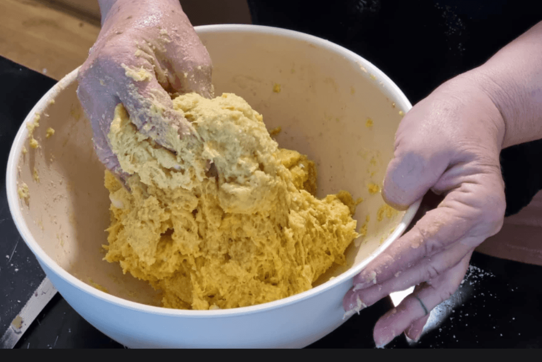 A questo punto unisco i tocchetti di scamorza, il sale, il pepe, impasto in modo energico e mi aiuto con l’olio extravergine per ottenere un panetto liscio, elastico e morbidissimo.