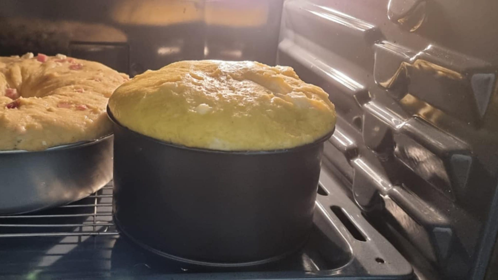 Trasferisco l’impasto in uno stampo di 20/22 cm (quello di alluminio oppure quello a cerniera), e lo metto a lievitare nel forno spento con la luce accesa per circa 3-4 ore, finché raggiunge il bordo dello stampo.