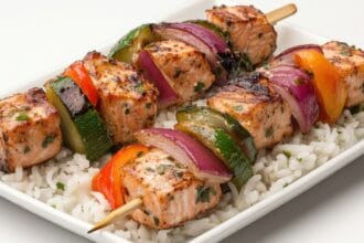 Spiedini di salmone e verdure con riso basmati: un piatto leggero, colorato…