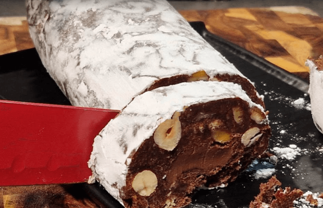 Quando il salame dolce sarà indurito, passiamolo nello zucchero a velo e serviamo in tavola!