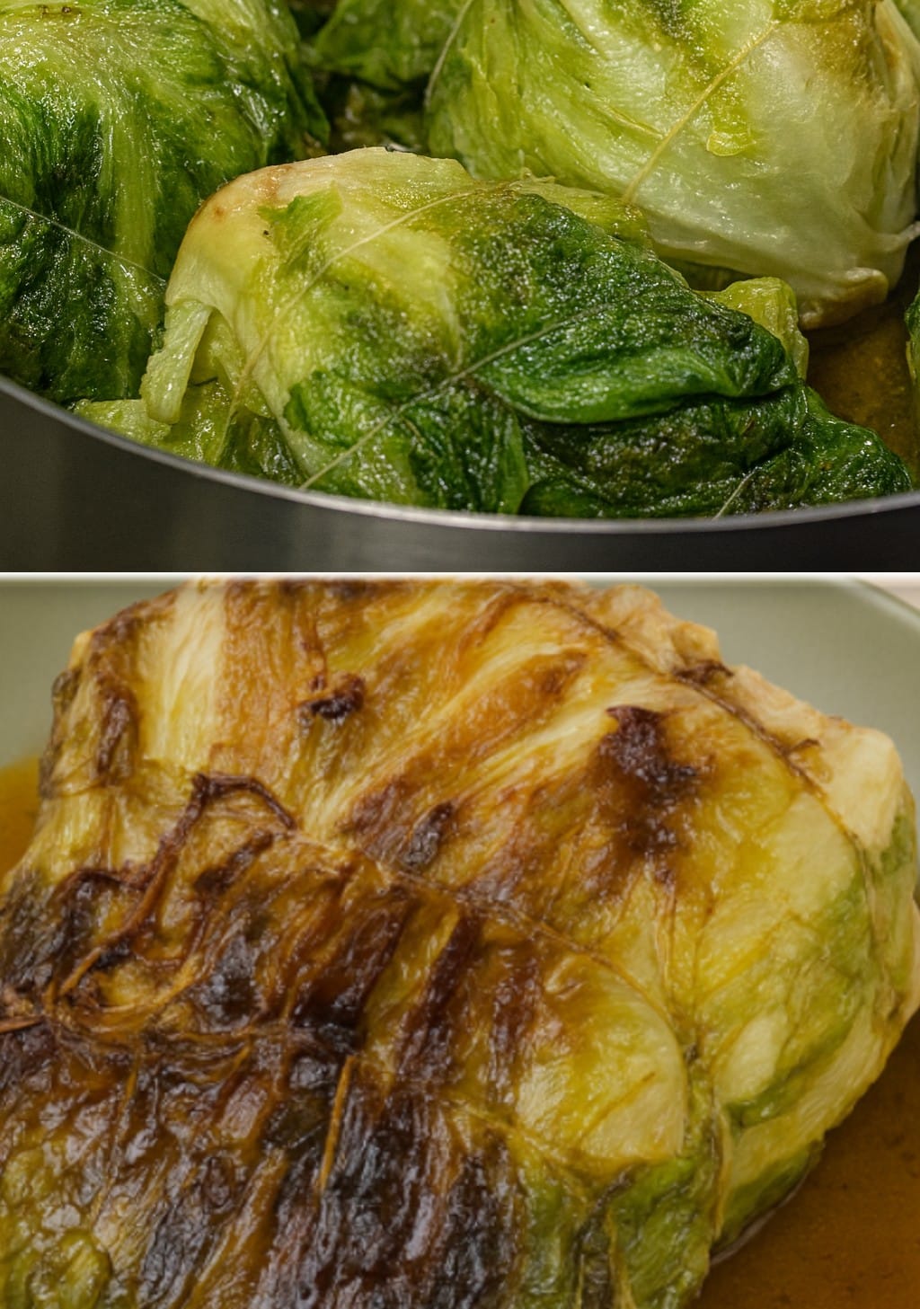 Sistemo le scarole ripiene in una casseruola con un filo d’olio e uno spicchio di aglio. Appena l’aglio sprigiona il suo profumo aggiungo le scarole e le faccio rosolare su tutti i lati, poi pggiungo mezzo bicchiere d’acqua, copro con il coperchio e lascio cuocere dolcemente per circa 40-50 minuti, finché l’acqua sarà evaporata e sul fondo resterà solo l’olio profumato.