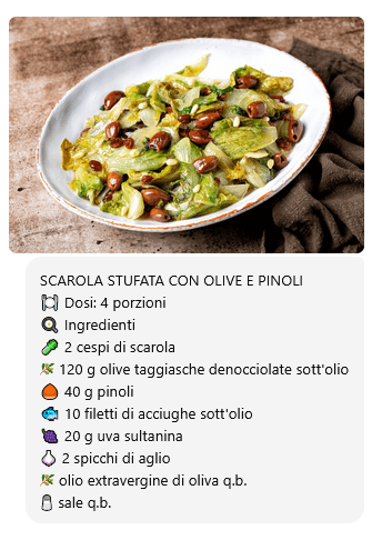 Veloce, gustosa, saporita, la scarola stufata con le olive, i pinoli e le acciughe, è un piatto vero e proprio, non è un semplice contorno.