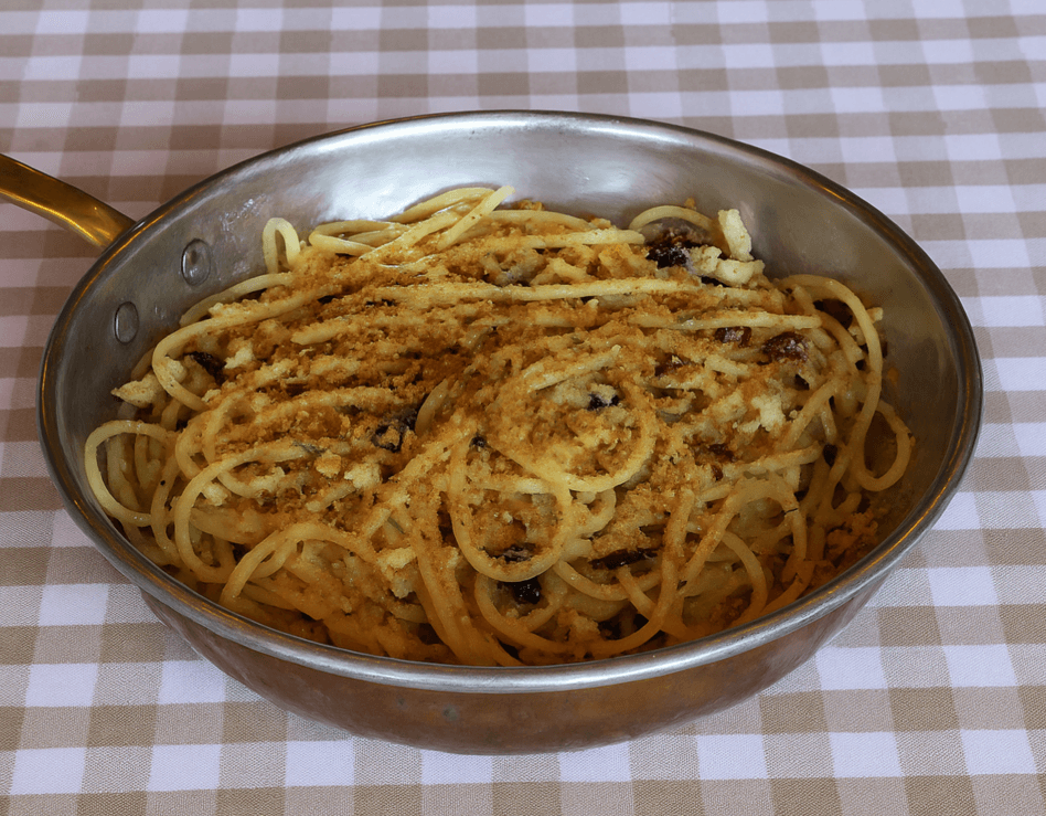 Tuffiamo gli spaghetti, preleviamoli con l’apposito arnese qualche minuto prima della cottura indicata sulla confezione, poi uniamoli nella padella dove abbiamo sciolto le alici e amalgamiamo con cura il condimento, aggiungendo un po’ di acqua di cottura per risottare. Dopodiché impiattiamo, spolveriamo con il pane croccante e portiamo in tavola.