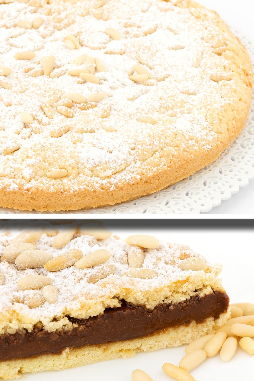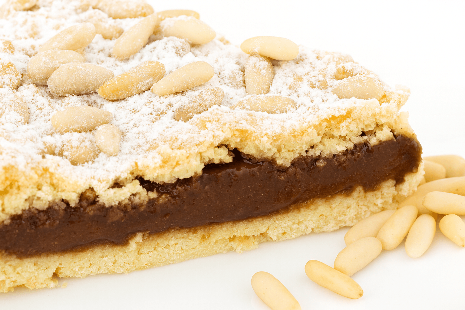 Riprendo la frolla, la divido in due parti (una leggermente più grande). Stendo la porzione maggiore e la sistemo in una tortiera da 28 cm imburrata e infarinata. Bucherello il fondo con una forchetta e verso la crema al cioccolato. Copro con il secondo disco di frolla, sigillo bene i bordi e bucherello la superficie. Cospargo di pinoli e inforno a 160°C in forno ventilato per 40–45 minuti, finché la torta risulta dorata.