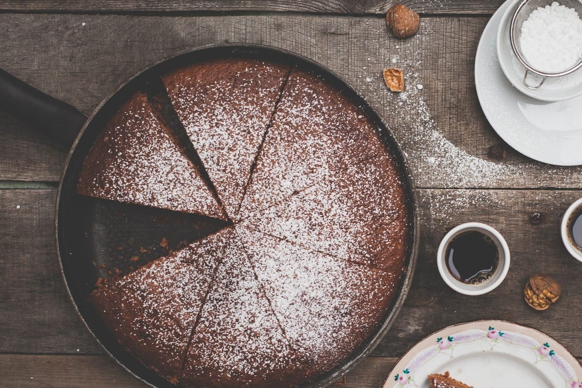 La torta di castagne e nocciole senza burro è pronta da servire.