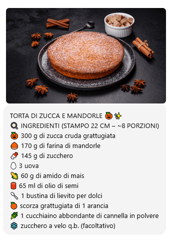Un dolce autunnale che sa di casa, di forno acceso e di profumo d’arancia e cannella. La torta di zucca e mandorle è un dolce morbido, umido al punto giusto e naturalmente senza burro. Si prepara in pochi passaggi, con ingredienti semplici, ed è perfetta per la colazione o per accompagnare una tazza di tè nelle giornate più fredde. La zucca dona una consistenza vellutata e dolce, mentre la farina di mandorle la rende delicata e ricca di aroma.
