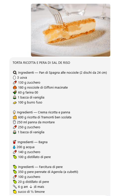 La base è un pan di Spagna alle nocciole, la farcitura è una crema di ricotta e panna intervallata da dadini di pere aromatizzate. È facile, quindi, capire che è davvero una ricetta golosa.
