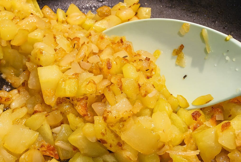 In una ciotola preparo il condimento: trito finemente la cipolla, schiaccio l’aglio e li mescolo insieme ai cubetti di zucchina. Lascio insaporire per qualche minuto, quindi verso tutto in una padella capiente con un generoso filo d’olio extravergine.